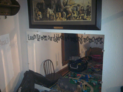 A huge mirror the exact width of my train table. How cool!? My sister at the Crafty Cave made me a vinyl for it (Excuse the mess, our children are making memories.) and Micheal hung it up! I LOVE it! Not only did my in-laws have one giant mirror, they had two. But one had quite a bit of water damage and the protective layer of sticky paper wouldn't come off. It's actually the first one we tried to use and I was feeling discouraged until they said they had another. :) So...they were getting ready to pitch the first one and I, in all my frugality, asked my father-in-law if he could cut the usable pieces up into 8x10 table top mirrors. Sometimes I think he wants to sigh at me but he's a really good sport. So he cut them up but the edges were still a little rough for me to comfortably give to children so instead of going to the work of sanding them down I edged them all in fun duck tape! I am SO excited to use this in my little daycare/preschool for all kinds of fun things. We can do play-doh on them, eat on them like place mats, write on them with window crayons/markers, etc. The sensory experiences we will have with them!!! Oh, my excitement! It worked out perfectly because I'll have 6 little people and I have 7 tabletop mirrors.